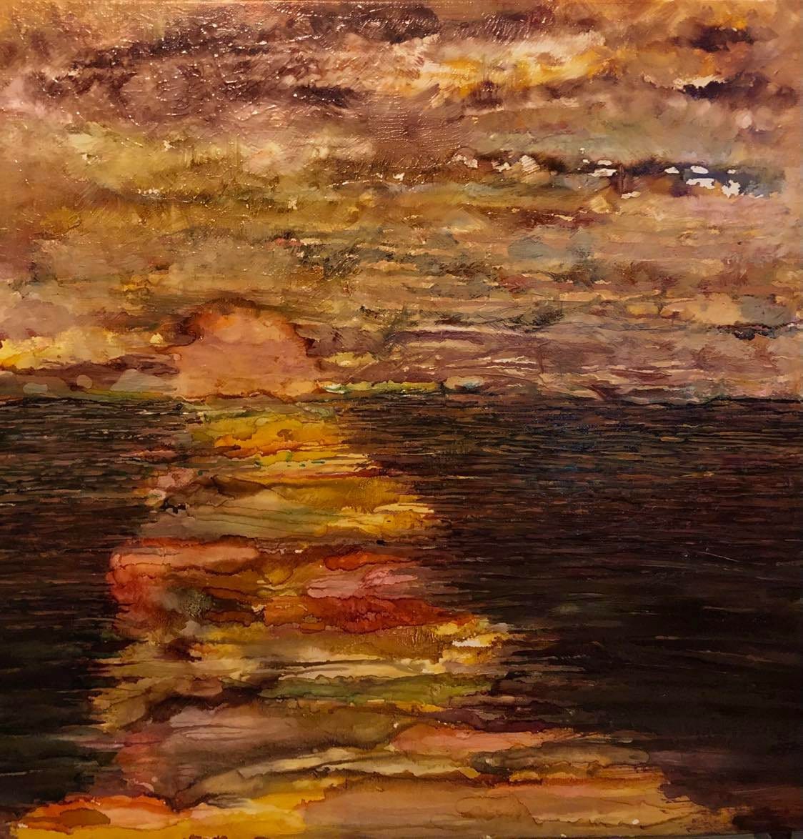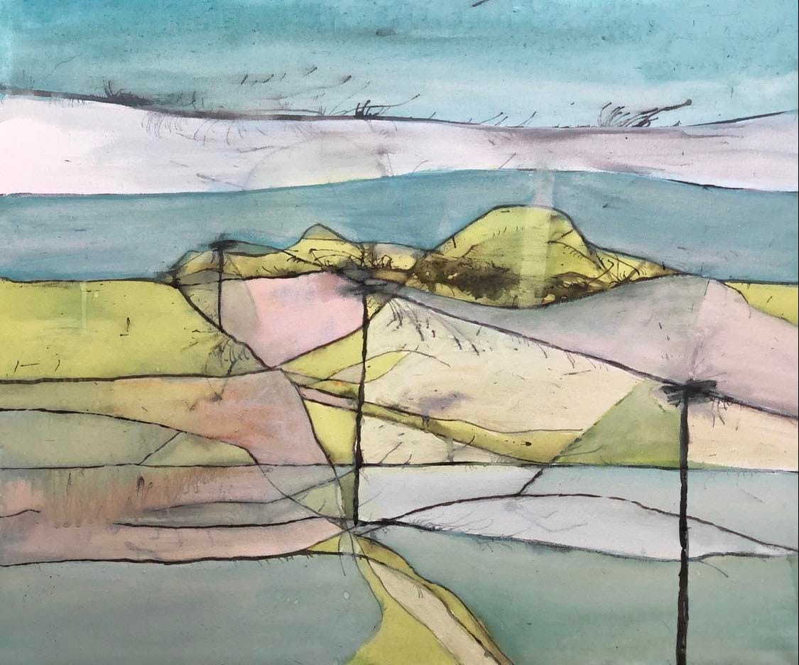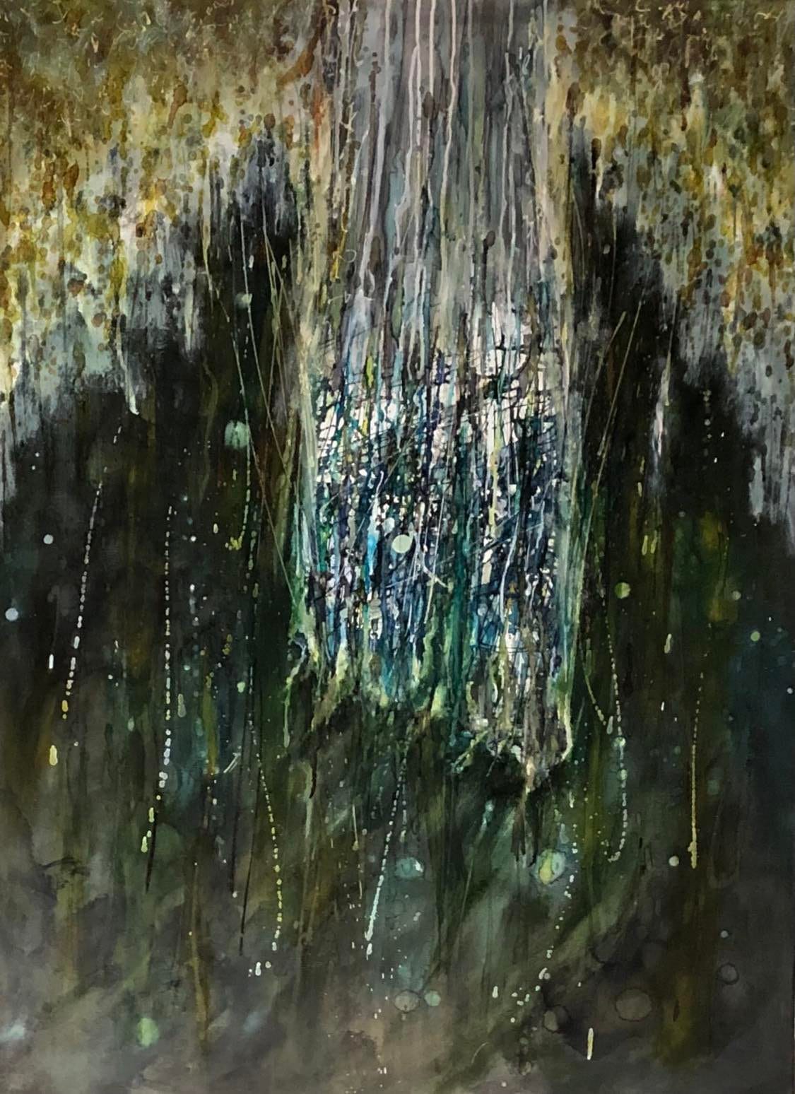 Ink on ink on wax on acrylic on canvas. 50 x 70cm. Photograph by the artist.